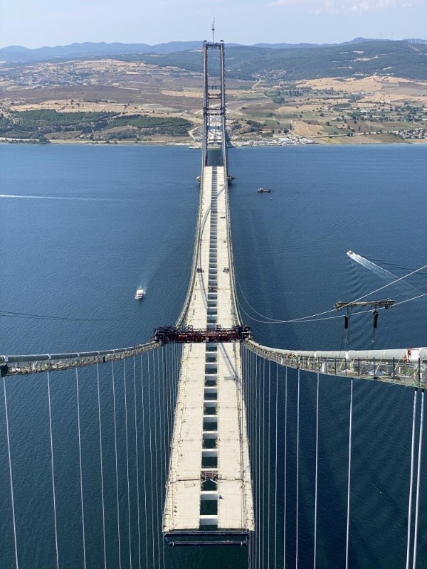 Tamamlandığında dünyanın en uzun orta açıklıklı asma köprüsü unvanının sahibi olacak 1915 Çanakkale Köprüsü, inşasında kullanılan ileri teknolojiler ve üstün teknik özellikleriyle dünya basınının da yer alıyor. Dünya çapında bir mega proje olan 1915 Çanakkale Köprüsü ve Otoyoluna, inşaat sektörünün lider yayını Engineering News-Record (ENR) dergisinin 27 Eylül-4 Ekim 2021 tarihli yeni sayısında 10 sayfalık yer ayrıldı. Ulaştırma ve Altyapı Bakanlığı Karayolları Genel Müdürlüğü (KGM) tarafından yap-işlet-devret (YİD) modeliyle ihale edilen, inşaat çalışmaları DL E&C, Limak, SK ecoplant ve Yapı Merkezi ortaklığı tarafından yürütülen 1915 Çanakkale Köprüsü ve Otoyolu Projesi, uluslararası alanda da takdir görüyor. Otoyol sathını oluşturacak 87 tabliyeden 81’inin montajı geçtiğimiz günlerde tamamlandı. 1915 Çanakkale Köprüsü, kullanılan ileri teknolojiler ve üstün teknik özellikleriyle, uluslararası inşaat sektörünün referans yayınlarından Engineering News-Record’da özel bir bölüm ile yer aldı. Türk şirketlerinin de ön sıralarda yer aldığı ve her sene yayınlanan "Dünyanın En Büyük Uluslararası Müteahhitleri" listesi ile tanınan Engineering News-Record’un (ENR) son sayısına damga vuran 1915 Çanakkale Köprüsü için 10 sayfalık özel bir bölüm hazırlandı. Köprü hakkındaki haberi hazırlamak için derginin kıdemli editörü Aileen Cho, Los Angeles’tan Çanakkale’ye gelerek, yetkililerden bilgi aldı ve proje sahalarını yerinde ziyaret etti. Türkiye’nin batısında otoyol entegrasyonunu tamamlayacak ve İstanbul Boğazı geçişine yeni bir alternatif oluşturacak proje, dünyada inşaat sektörüne örnek olmaya devam ediyor. ENR’da geniş yer bulan projede her geçen gün sona yaklaşılıyor. 18 Mart 2022’de açılması planlanan 1915Çanakkale Köprüsü ve Otoyolu Projesi’nde, otoyol tabliyelerinin montajı da büyük ölçüde tamamlandı. Geçtiğimiz günlerde ENR’ın 2021 yılı Dünyanın En Büyük 250 Uluslararası Müteahhidi sıralamasında 1915 Çanakkale Köprüsü ve Otoyolu Projesi’nin ortak müteahhitleri Limak 56. sırada ve Yapı Merkezi 68. sırada, Projenin Güney Koreli ortakları DL E&C 83. sırada ve SK ecoplant ise 62. sırada yer almıştı.