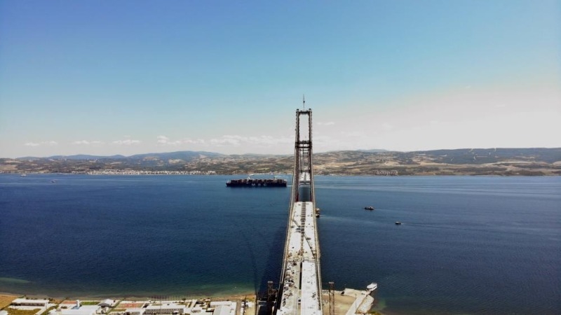 Tamamlandığında 'dünyanın en büyük orta açıklığına sahip asma köprüsü' unvanına kavuşacak olan 1915 Çanakkale Köprüsü’nün 53’üncü tabliye bloğu yerleştirildi. Asya ve Avrupa yakalarını birbirine bağlayacak olan boğaz köprüsünde karşıdan karşıya geçiş süresi 6 dakikaya inecek. Cumhurbaşkanı Recep Tayyip Erdoğan tarafından 18 Mart 2017'de temeli atılan 1915 Çanakkale Köprüsü’nde çalışmalar tüm hızıyla devam ediyor. Kenar açıklıkları ve yaklaşım viyadüklerinin kenar aralıklarına 25, 2023 metre orta açıklığa ise 27 olmak üzere toplamda 53 tabliye bloğunun montajı yapıldı. 87 tabliyenin 53’ünün yerleştirilmesiyle birlikte iki kule arasındaki araçların geçeceği köprü yolunun da yarısından fazla tamamlanmış oldu. Nüfusa paralel olarak artan araç sayısıyla birlikte Çanakkale Boğazı, özellikle bayram tatillerinin yanı sıra yaz aylarında yaşanan yoğunluğa bağlı olarak uzun bekleme süresiyle geçilebilirken, kış aylarında olumsuz hava koşullarının etkili olduğu günlerde ulaşımda aksamalar yaşanıyor. Tüm bu problemlere kalıcı çözüm üretecek ve boğazda kesintisiz ulaşım sağlayacak olan 1915 Çanakkale Köprüsü'nün hizmete açılması için geri sayım başladı. Avrupa ve Asya kıtalarını Çanakkale Boğazı'nda ilk kez birbirine bağlayacak 1915 Çanakkale Köprüsü'nün temeli, Cumhurbaşkanı Recep Tayyip Erdoğan tarafından 18 Mart 2017'de atılmıştı. Aradan geçen 4,5 yıllık süre sonunda Malkara ile Çanakkale arasında 1915 Çanakkale Köprüsü’nü de içeren 88 kilometre otoyol ve 13 kilometre bağlantı yolundan oluşuyor.