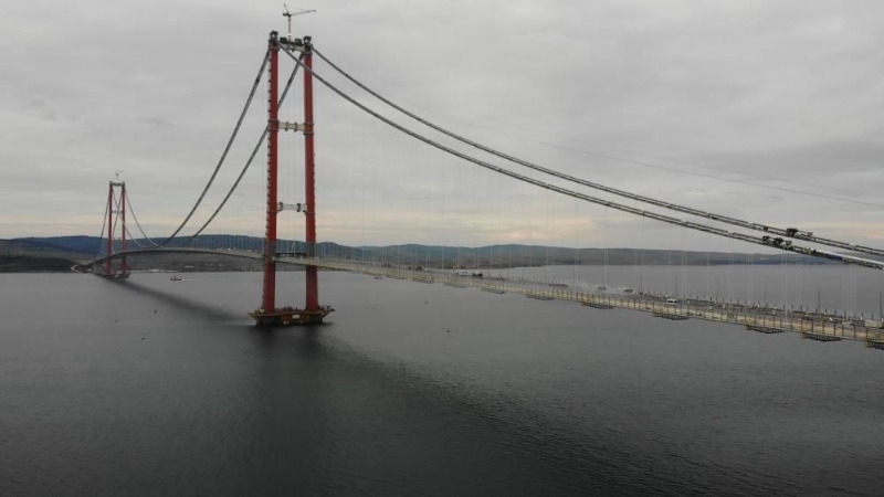 3.1 milyar Euro’ya mal olan proje yap-işlet-devret modeliyle hayata geçirildi. 11 yıl sonra devlete iade edilecek köprünün yapımı boyunca pandemi koşullarında da en yüksek güvenlik önlemleriyle birlikte 12 bin kişi çalışıyor. Avrupa ve Asya kıtalarını Çanakkale Boğazı'nda ilk kez birbirine bağlayacak 1915 Çanakkale Köprüsü'nün temeli, Cumhurbaşkanı Recep Tayyip Erdoğan tarafından 18 Mart 2017'de atılmıştı. Aradan geçen 5 yıllık süre sonunda Malkara ile Çanakkale arasında 1915 Çanakkale Köprüsü’nü de içeren 88 kilometre otoyol ve 13 kilometre bağlantı yolundan oluşuyor. Her biri 45 metre genişliğinde, 48 metre uzunluğunda ve 700 ton ağırlığındaki tabliye bloklarının bağlanacağı askı halatlarının ana halatlara montaj işlemi 6 Temmuz 2021’de başlamıştı. 12 Aralık 2021’de de Cumhurbaşkanı Recep Tayyip Erdoğan’ın katılımıyla, Asya ve Avrupa’daki kule ayaklarının orta açıklığına son tabliye bloğu yerleştirildi.