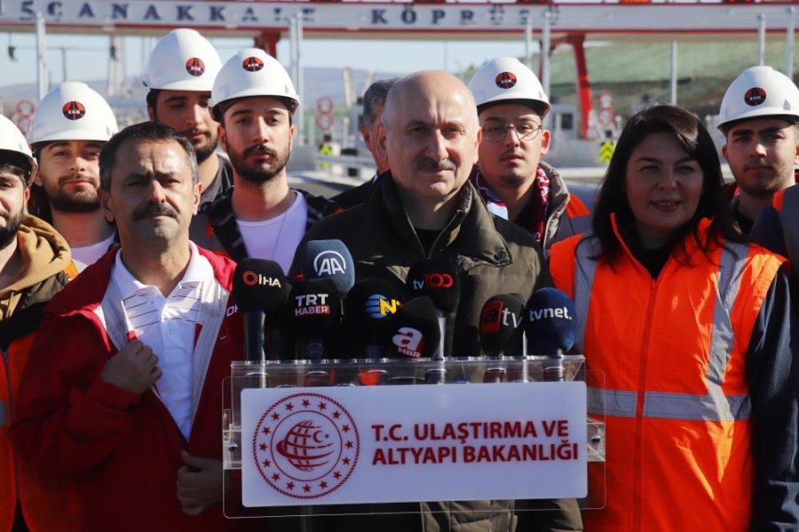 Ulaştırma ve Altpayı Basanı Adil Karaismailoğlu, açılışa sayılı günler kala 1915 Çanakkale Köprüsü'nden yürüyerek Asya'dan Avrupa kıtasına geçti. Basın mensupları ile yaklaşık 70 dakika süren kıtalar arası geçişin ardından Avrupa yakasında Karaismailoğlu açıklamalarda bulundu. 1915 Çanakkale Köprüsünü yürüyerek geçtiklerini ifade eden Karaismailoğlu, “Bizler Çanakkale’ye her geldiğimizde aynı zamanda hilali yere düşürmemek için Çanakkale’yi destan şehir haline getiren aslanlarımızın, aziz şehitlerimizin manevi huzuruna da çıkıyoruz. Onlar, savaşta gösterdikleri müthiş kahramanlıkları ile tüm dünyaya, Türkiye’nin düşmanlarına bir şey öğretti; “Çanakkale’nin Geçilemediğini” Çünkü Çanakkale düşman için hiçbir zaman geçilemeyecektir. Ancak, söz konusu dostluk, kardeşlik, üretim, ticaret, turizm, istihdam olunca, sadece 6 dakikalık konforlu bir yolculuk ile Çanakkale Boğazı’nın bir yakasından diğer yakasına geçmek mümkün olacak Değerli Arkadaşlar, Az önce hep birlikte Asya ile Avrupa kıtalarını Çanakkale Boğazı'nda ilk kez birbirine bağlayan 1915 Çanakkale Köprümüz üzerinde yürüdük. Kesintisiz bir şekilde Asya’dan Avrupa’ya geçerek tarihi anlara tanıklık ettik” dedi. Türkiye Cumhuriyeti tarihindeki en önemli ulaşım yatırımlarının başarıyla tamamlandığını ifade eden Karaismailoğlu, “Marmaray gibi, İstanbul Havalimanı gibi, Avrasya Tüneli gibi, Yavuz Sultan Selim ve Osmangazi Köprüleri gibi Türkiye Cumhuriyeti tarihindeki en önemli ulaşım projelerinden birini daha başarıyla tamamlıyoruz ve tarihe not düşüyoruz. Bir hafta sonra 26 Şubat 2022 tarihinde de Sayın Cumhurbaşkanımızın teşrifleri ile köprümüzü aziz milletimizin ve dünyanın hizmetine sunacağız. Yatırım bedeli 2 Milyar 545 Milyon Euro tutarındaki Malkara-Çanakkale Otoyolu ve 1915 Çanakkale Köprüsü ile Çanakkalelileri ve tüm milletimizi şanlı tarihine ve 21. Yüzyıl’a yaraşır bir eser ile buluşturuyoruz” dedi. Proje hakkında bilgi veren Bakan Adil Karaismailoğlu, “Bildiğiniz üzere 1915 Çanakkale Köprüsü, 89 kilometresi otoyol ve 12 kilometresi bağlantı yolu olmak üzere toplam 101 kilometre uzunluğundaki Malkara-Çanakkale Otoyolu’na dahildir. Yaklaşık 5 bin 100 personel ve 740 adet iş makinesi ile gece gündüz çalışarak inşa ettiğimiz bu eşsiz proje, orta ve yan açıklıkları ile yaklaşım viyadüklerinin toplamıyla, geçiş uzunluğu 4 bin 608 metreye ulaşan köprümüz, kendi alanında dünyada ilk sırada yer alan bir eserdir” dedi. 1915 Çanakkale Köprüsünün semboller köprüsü olduğunun altını çizen Bakan Karaismailoğlu, “Köprünün 2023 metrelik orta açıklığı Cumhuriyetimizin 100'üncü kuruluş yıl dönümünü, 318 metrelik çelik kuleleri de Çanakkale Deniz Zaferi'nin kazanıldığı 18 Mart 1915'i sembolize etmektedir. Kulelerin kırmızı beyaz rengi ise Al Bayrağımızı temsil etmektedir. 2023 metrelik orta açıklığı ile dünyanın en uzun orta açıklıklı asma köprüsüdür. Deniz seviyesinden yüksekliği, Seyit Onbaşı’nın sırtında taşıdığı, savaşın kaderini değiştiren 16 metrelik top mermisinin figürü ile birlikte 334 metreye ulaşan kule yüksekliği ile köprümüz, dünyanın en yüksek kulelerine sahip asma köprüsü olacaktır. Yine iki çelik kule arasındaki Köprümüz, dünyada ikiz tabliye olarak tasarlanan nadir asma köprülerden biri olma özelliğine de sahiptir. Tamamlanınca, dünyada 2.000 metre orta açıklığın üzerinde ikiz tabliye olarak dizayn ve inşa edilen ilk köprü olarak tarihe geçecektir" dedi. Köprünün enleri hakkında bilgi vere Karaismailoğlu, “Bunların yanı sıra köprümüzün enleri arasında sayılacak birkaç ilginç bilgi daha paylaşmak istiyorum. Köprümüzün ana kablosunda kullanılan 162 bin kilometrelik toplam tel uzunluğu ile Dünyanın çevresi 4 kez dönülebilmektedir. Kule kesonları alan olarak kıyaslandığında 1 futbol sahası büyüklüğündedir. Köprüde kullanılan 227 bin m’lük Beton ile 100 m’lik 5 bin 900 adet daire, yani 25 bin nüfuslu bir ilçe kurulabilir. Köprüde kullanılan 177 bin ton Çelik ile 177 bin adet binek otomobil üretilebilmektedir. Ayrıca, köprü kulelerinin üst bağ kirişinin yerleştirilmesi esnasında 155 ton ağırlık ve 318 metre yükseklik parametreleri baz alındığında dünyada yapılan en büyük ağır kaldırma operasyonu gerçekleştirilmiştir. Yani, 1915 Çanakkale Köprümüz “en”lerin projesidir. Çanakkale Boğazı’na adeta mühür vuracak ve ülkemizin simge yapılarından biri olacaktır” dedi. Proje kapsamında yapılan çalışmalar hakkında bilgi veren Bakan Karaismailoğlu “Proje kapsamında; 1 adet Asma Köprü, 2 adet Yaklaşım Viyadüğü, 2 adet Betonarme Viyadük, 6 adet Hidrolik Köprüsü, 6 adet Alt Geçit Köprüsü, 43 adet Üst Geçit, 40 adet Alt Geçit ve 236 adet Menfez inşa ettik. 12 adet Kavşak, 4 adet Otoyol Hizmet Tesisi, 5 adet Ücret Toplama İstasyonu ve biri Ana Kontrol Merkezi ve Bakım İşletme Merkezi olmak üzere 2 adet Bakım İşletme Merkezi’nde de çalışmaları bitirdik. Peyzaj çalışmaları kapsamında 516 bin 863 adet fidan diktik. Ayrıca, trafik güvenliği çalışmaları kapsamında; 2 bin 557 adet aydınlatma direği, 6 bin 360 m2 Düşey Levha Montajı, 167 bin m2 yatay işaretleme, 411 km. otokorkuluk, 196 km. tel çit ve 17,5 km. uzunluğunda yaya otokorkuluk montajı gerçekleştirdik. Akıllı Ulaşım Sistemleri kapsamında da;225 bin 250 metre uzunluğunda Fiber Optik İletişim Altyapısı tesis ettik” dedi. Üretim, ticaret ve turizm faaliyetlerinin gelişmesi açısından ulaşım olmazsa olmaz bir etken olduğunun altını çizen Karaismailoğlu “Bakanlığımız uhdesinde 2003-2020 yılları arasında gerçekleştirile karayolları y