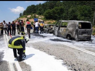 Çanakkale'den Çan ilçesi istikametine gitmekte olan Rıdvan Güçlü idaresindeki 17 YL 664 plakalı otomobil, Çanakkale-Çan Karayolu'nun 33'üncü kilometresinde dikkatsizlik sonucu kontrolden çıkarak karşı şeride geçti. Karşı yönden gelen Muharrem Özcan yönetimindeki 17 ZD 740 plakalı minibüsle kafa kafaya çarpışan otomobil, bir anda alev topuna döndü. Minibüs sürücüsü araçtan çıkmayı başarırken, otomobildeki 3 kişi bulundukları yerde sıkıştı. Otomobilde bulunan sürücü Rıdvan Güçlü ile Hediye Güçlü ve Feti Güçlü, yanarak feci şekilde can verdi. Olay yerine çok sayıda ambulans ve itfaiye ekibi sevk edildi. Yaralı minibüs sürücüsü ambulansla hastaneye gönderilirken, itfaiye ekipleri yanan araçlara müdahale ederek söndürdü. Ölenlerin kimliğinin belirlenmesi için Jandarma ekipleri çalışma başlattı.