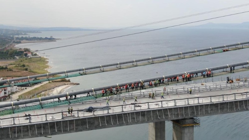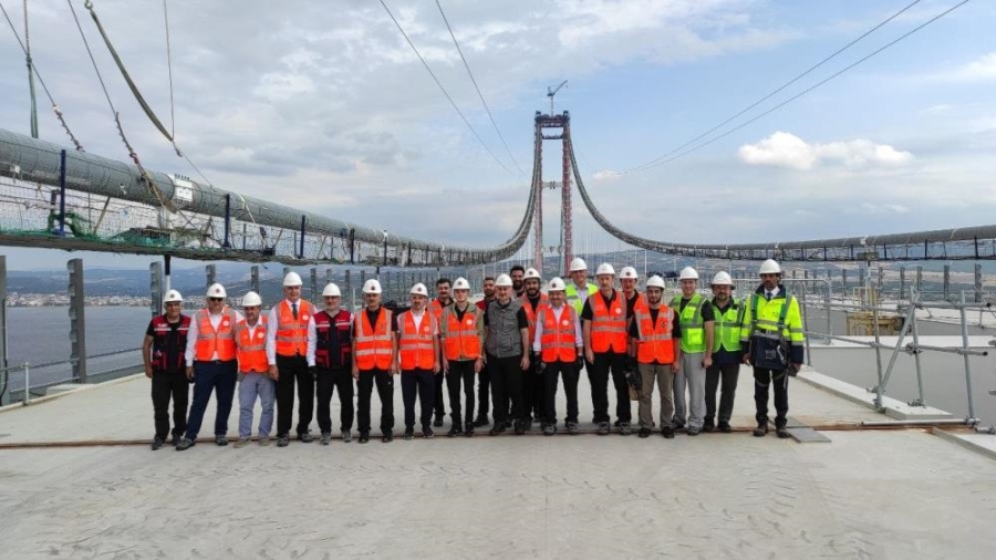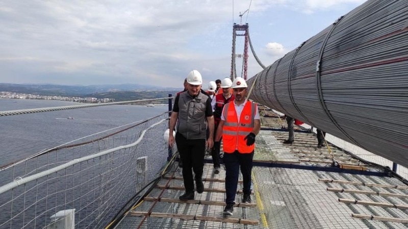 Ulaştırma ve Altyapı Bakanı Adil Karaismailoğlu, 1915 Çanakkale Köprüsünü kullanarak Asya’dan Avrupa’ya geçti. 1915 Çanakkale Köprüsü’nde tarihî anlar yaşandı. Ulaştırma ve Altyapı Bakanı Adil Karaismailoğlu ve yanındaki protokol mensupları, 4 bin 608 metre uzunluğundaki, işçilerin üzerinde yürüdüğü ‘kedi yolu’na çıkarak, Asya’dan Avrupa yakasına geçti. 1915 Çanakkale Köprüsünün büyük ölçüde tamamlandığını ifade eden Bakan Karaismailoğlu, “Sadece kulelere yakın kısımlardaki tabliyelerin montajı kaldı. Artık asırların hayâli için geri sayım başladı. Köprü, 101 kilometre uzunluğu ile Kınalı-Tekirdağ-Çanakkale-Savaştepe Otoyolu Projesi kapsamında yer alıyor. 2 bin 23 metre orta açıklık ve 770’er metre yan açıklıklar ile beraber 3 bin 563 metre uzunluğundadır. 2 bin 23 metrelik orta açıklık, Cumhuriyetimizin 100. kuruluş yıl dönümünü temsil ediyor ve tamamlandığında dünyanın en büyük orta açıklıklı asma köprüsü unvanına sahip olacak. 365 ve 680 metrelik yaklaşım viyadükleri ile beraber toplam geçiş uzunluğu ise 4 bin 608 metreye ulaşıyor. Köprümüzün 318 metrelik çelik kuleleri, Çanakkale Deniz Zaferinin kazanıldığı 18 Mart 1915’i işaret edecektir. İki çelik kule arasındaki köprümüz, dünyada ikiz tabliye olarak tasarlanan nadir asma köprülerden biri olma özelliğine de sahip. Tamamlanınca, dünyada 2 bin metre orta açıklığın üzerinde ikiz tabliye olarak tasarlanan ve inşa edilen ilk köprü olarak tarihe geçecek. 318 metrelik kule yüksekliği ve 16 metrelik mimarî amaçlı top mermisi figürüyle birlikte düşünüldüğünde deniz seviyesinden 334 metre yüksekliğe erişecek ve dünyanın en yüksek kulelerine sahip asma köprüsü olacak. Kısaca 1915 Çanakkale Köprüsü Çanakkale Boğazına adeta mühür vuracak ve ülkemizin simge yapılarından bir olacak” dedi. Asma köprü kule temelleri Asya tarafında -45 metre, Avrupa tarafında ise -37 metre derinlikte iyileştirilmiş deniz tabanına serbestçe oturduğunu ifade eden Bakan Karaismailoğlu, “2 x 3 trafik şeritli Köprümüzün tabliyesi, 45 metre genişlikte ve 3,5 metre yükseklikte ikiz tabliye olarak projelendirildi. 1915 Çanakkale’de; kuru havuz ve ıslak havuzda keson imâlatları, plint ve bağ kirişi imalatları, ankraj blokları, kule montajı, ana kablo montajı, tabliye montajı ve üst yapı çalışmaları gibi yapım tekniği açısından birçok önemli imâlat kalemi yer alıyor. Köprüde 162 bin kilometre uzunluğunda, yani dünyanın etrafında dört defa dönecek kadar çelik tel kullanılmakta. Bölgedeki yüksek rüzgâr hızları dikkate alınarak tasarlanan köprümüz, gerek işletme döneminde gerekse de inşaat sırasında oluşacak en elverişsiz rüzgâr etkilerine karşı stabilitesi test edilmiş ve bu testlerden başarıyla çıkmıştır. Köprümüzün kule temelleri, olası büyük depremlere karşı çelik kazıklarla güçlendirilmiş ve zemin üzerinde konumlandırılmış batırma keson tipi temel seçilmiştir. Görevli Şirket tarafından yapım bedeline 2 bin 332 milyar euro, kamulaştırma çalışmalarına ise 579 milyon TL harcama yapılmıştır” diye konuştu. Kule keson temellerinin konumlandırıldığı alandaki deniz tabanında zemin iyileştirmesi için güney kulede 165 adet, kuzey kulede ise 203 adet olmak üzere toplam 368 adet 2,5 metre çapındaki çelik kazık çakıldığını belirten Bakan Karaismailoğlu, “Ana kablo imalatları tamamlanarak, 304 adet tel demetinden oluşan ana kablonun 5 Şubat 2021 tarihinde montaj çalışmalarına başlanılarak, montaj, ön sıkıştırma ve nihai sıkıştırma çalışmaları ile askı kelepçeleri ve düşey askı halatlarının montaj çalışmaları tamamlandı. Montajları tamamlanan 66 adet mega blok, 21 adet tek blok, Gölcük Çimtaş Tesisleri’nden Gelibolu kuru havuz bölgesindeki tabliye stok sahasına intikal ettirildi. Bugüne kadar orta açıklıkta 38 adet, yan açıklıklarda 32 adet olmak üzere toplamda 70 adet tabliye bloğunun montajı bitirildi. İtme - sürme yöntemi ile inşa edilen 680 metre uzunluğundaki Asya Yaklaşım Viyadüğü ile 365 metre uzunluğundaki Avrupa Yaklaşım Viyadüğü tamamlandı. 1915 Çanakkale Köprüsü yapım çalışmaları devam ederken bir yandan da otoyol yapım çalışmalarımız devam ediyor. Bugüne kadar 2 betonarme yaklaşım viyadüğü, 2 betonarme viyadük, 6 hidrolik köprüsü, 5 alt geçit köprüsü, 39 üst geçit, 40 alt geçit, 227 menfez ve 4 kavşak tamamladık. 1 köprü, 4 üst geçit, 1 kutu menfez, 8 kavşak, 4 otoyol hizmet tesisi, ve 2 bakım işletme merkezinde de çalışmalar hızla devam ediyor. Yaklaşık 5 bin 100 personel ve 809 adet iş makinesi ve 7/24 çalışma esasıyla başarıyla sürdürdüğümüz çalışmalarımız sonucunda projemizin, 18 Mart 2022’de hizmete girmesi için yorulmak bilmiyoruz. Yollar, akarsular gibi geçtiği her yere can verir. Yapılan her yeni yol, akarsular gibi, geçtikleri yerlerin istihdamına, üretimine, ticaret, kültür ve sanatına can katmaktadır. Türkiye ekonomisinin omurgasını oluşturan Marmara ve Ege bölgelerini tam otoyol ağı ile birbirine bağladık. İstanbul-İzmir Otoyolu ve Yavuz Sultan Selim Köprüsü’nün de dâhil olduğu toplam 400 kilometre uzunluğundaki Kuzey Marmara Otoyolunu trafiğe açtık. 1915 Çanakkale Köprüsü ve 101 kilometre uzunluğundaki Malkara-Çanakkale Otoyolunun da hizmete girmesiyle Marmara Otoyol Entegrasyonu tam anlamıyla sağlanmış olacak. 1915 Çanakkale Köprüsü, feribotla 30 dakikada geçilen ancak bekleme süresiyle ve hava durumuna göre çoğu zaman saatler süren Çanakkale Boğazından geçiş süresini 6 dakikaya indirecek. Proje tamamlandığında yıllık zaman tasarruf tutarı 624 milyon liraya, akaryakıt tasarruf tutarı ise 113 milyon liraya ulaşacak