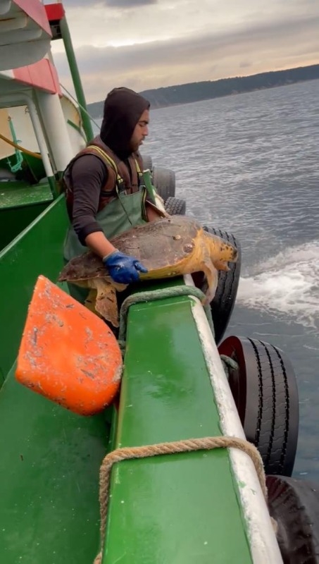 Çanakkale’de balık avı için denize açılan bir balıkçı teknesinin ağlarına caretta caretta takıldı. Ekolojik dengenin önemine değinen balıkçılar, kaplumbağaya zarar vermeden doğal yaşam alanı olan denize bıraktı. Eceabat ilçesi Kabatepe Limanı açıklarında tırsi balık avı için açılan 30 metrelik ‘Çalı Balıkçılık’ isimli teknenin kaptanı Naci Karabiber ve tayfası ağları denize bıraktı. Belli bir süre sonra ağlar yeniden tekneye alınınca içerisinde yaklaşık 55 kilogram ağırlığında bir caretta caretta olduğunu gördüler. Kaplumbağayı ağdan kurtaran balıkçılar, hayvanı doğal yaşam alanı olan denize saldılar. O anları da kayıt altına alan balıkçılar, “Ekolojik dengeyi korumaya çalışıyoruz” ifadelerine yer verdi.
