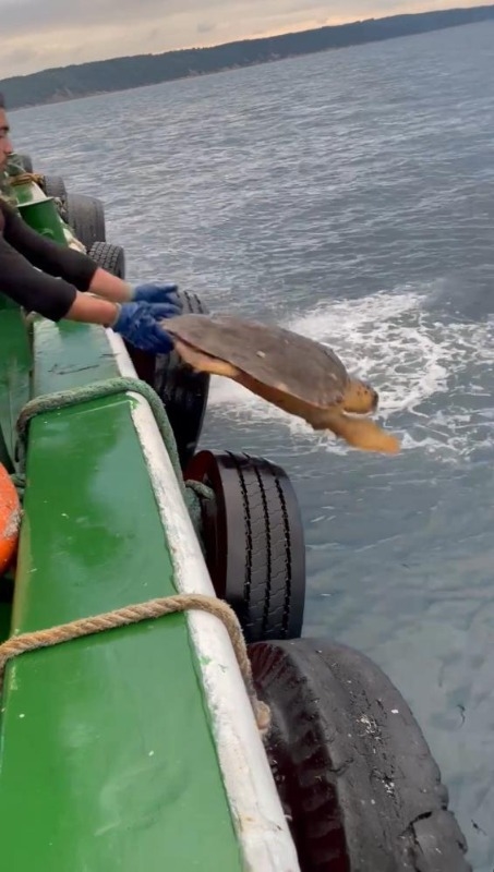 Balıkçı ağlarına takılan caretta caretta denize salındı