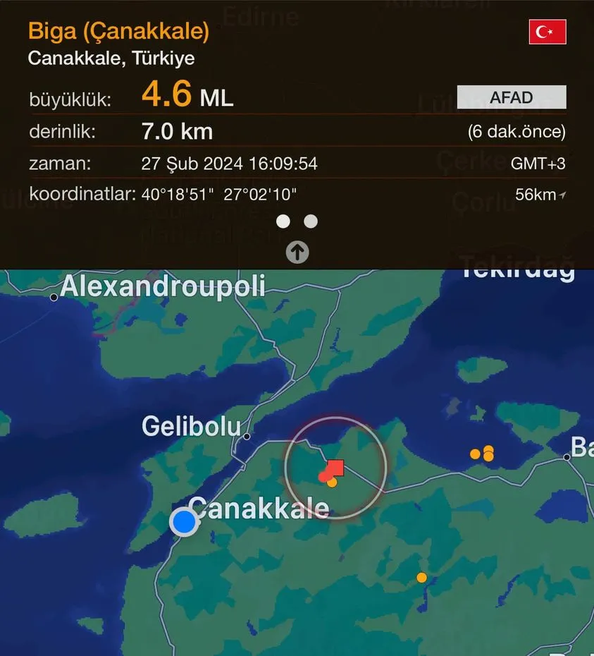 Biga ilçesinde 4.6 büyüklüğünde deprem meydana geldi.