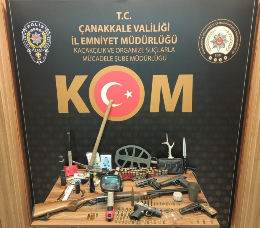Çanakkale’de gerçekleştirilen tarihî eser kaçakçılığı operasyonunda 3 şüpheli gözaltına alındı. Çanakkale Emniyet Müdürlüğü Kaçakçılık ve Organize Suçlarla Mücadele (KOM) Şube Müdürlüğü ekipleri, izinsiz tarihî eser arama ve kaçakçılığına yönelik suçların önlenmesine yönelik gerçekleştirdikleri operasyonda O.E., G.U. ve B.Ü. isimli şüphelileri yakaladı. Şüphelilerin evlerinde yapılan aramalarda 3 adet kurusıkı tabanca ve bu tabancalara ait 76 adet mermi, ruhsatı bulunmayan 1 adet yivsiz av tüfeği ve bu tüfeğe ait 39 adet fişek, 1 adet 6136 SKM kapsamında siyah saplı bıçak (kama), 1 adet kurusıkı tabancadan döndürülme ağzı açılmış tabanca, çeşitli çaplarda 18 adet mermi tarihi eser olduğu değerlendirilen 7 adet obje ve 1 adet üç dallı geyik boynuzu, 1 adet metal arama dedektörü ve bu detektöre ait parçalar, 1 adet kazma ve tek gözlü el dürbünü ele geçirildi. Gözaltına alınan O.E., G.U. ve B.Ü. isimli şüphelilere emniyetteki sorgularının ardından adli işlem yapılırken, savcılık talimatıyla serbest bırakıldı.