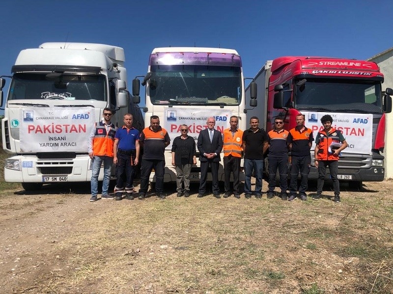 Sel felaketinde zarar gören Pakistan'daki afetzedelere ulaştırılmak üzere Çanakkale Valiliği öncülüğünde AFAD İl Müdürlüğü koordinasyonunda hazırlanan gıda ve temizlik malzemesi taşıyan 3 yardım tırı Pakistan’a uğurlandı. Pakistan’da meydana gelen sel felaketinden etkilenen afetzedelere yardım eli uzatmak amacıyla Cumhurbaşkanı Sayın Recep Tayyip Erdoğan’ın talimatları doğrultusunda İçişleri Bakanlığı Afet ve Acil Durum Yönetimi Başkanlığı öncülüğünde ülke genelinde eş zamanlı olarak başlatılan ve Çanakkale Valiliği koordinesinde yürütülen yardım Kampanyasında toplanan yardımlar, Pakistan’a gönderilmek üzere AFAD İl Müdürlüğü Lojistik deposu önünden Kocaeli’ne yola çıktı. Pakistan’a yardım kampanyasının sürdüğünü belirten Vali İlhami Aktaş, gıda kolilerinin hazırlanmasında katkısı olan kamu kurum ve kuruluşları ile sivil toplum kuruluşlarına teşekkür etti.