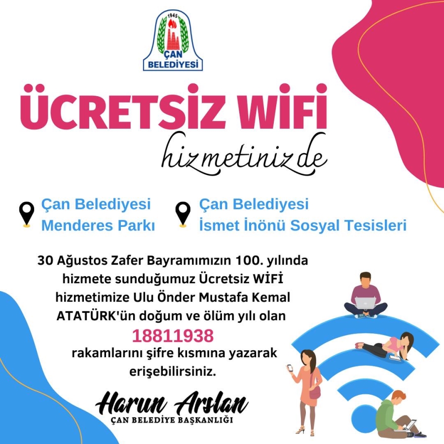 Çan’da belirlenecek farklı lokasyonlarda ücretsiz internet hizmeti yaygın hale gelecek. Zafer Bayramının 100’üncü yılında hizmete giren ücretsiz wifi hizmetini Çan Belediyesi sosyal medya hesabından, “30 Ağustos Zafer Bayramımızın 100. yılında hizmete sunduğumuz Ücretsiz WİFİ hizmetimize Ulu Önder Mustafa Kemal Atatürk'ün doğum ve ölüm yılı olan "18811938" rakamlarını şifre kısmına yazarak erişebilirsiniz. Belirlenecek farklı lokasyonlar ile hizmet noktalarımızı arttırarak şehrimizin birçok yerinde ücretsiz İnternet hizmetimizi yaygın hale getireceğiz” paylaşımı ile duyuruldu.