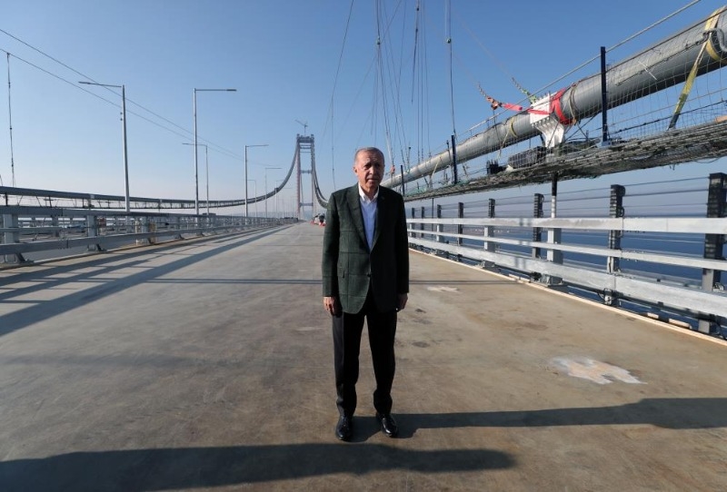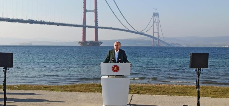 Otoyol ve köprü projesinin inşasında 670'i mühendis, 5 binin üzerinde kişi ve 740 iş makinesi çalıştığını, 106 alt yüklenicinin görev yaptığını anlatan Erdoğan, “Dünyanın en büyük orta açıklıklı köprüsü olan 1915 Çanakkale Köprüsü, tasarım mühendisliği inşası ve ülkemize kazandırdığı teknik birikimi ile gerçekten önemli bir eserdir. Şimdiden ülkemizin sembollerinden biri hâline dönüşen bu köprü büyük ve güçlü Türkiye hedefine bir adım daha yaklaştığımızın ispatıdır. Yatırımda, üretimde, ihracatta, istihdamda dünyanın en büyükleri arasına girmeyi hedefleyen Türkiye’nin ihtiyacı olan ulaşım altyapısının bu hayatî bölümünün tamamlanmasıyla artık geleceğe daha da umutla bakıyoruz. Yap-işlet-devret modeliyle inşa edilen bu köprü ile Türkiye yeni bir sıçrama dönemini daha başarı ile gerçekleştirmiş oluyor. Avrupa ile Asya ve Afrika kıt’alarını birleştiren küresel ulaşım projesinin önemli ayağının hizmete girmesiyle insanî ilişkiler, turizm, ticaret artacak, kolaylaşacaktır. Ülkemizin bu otoyol ve köprüden geçerek seri şekilde menzillerine giden araçların işletme yakıt ve vakit mâliyetlerinden elde edeceği büyük kazancı söylemeye gerek duymuyorum. Dünya tarihinin en ciddi lojistik krizlerini yaşadığı dönemde böyle bir projeyi hayata geçirmemiz kritik ve önemlidir. Artık 3 kıt’adaki bütün kara, deniz, demir, hava yollarının ülkemizden ve boğazlarımızdan geçmeye başladığı bir döneme giriyoruz. Bu anlayışla otoyollarımız, bölünmüş yollarımız, köprülerimiz ve tünellerimizle kara yolları standartlarını yükselttik. Tüneller, hızlı tren hatları, demir yollarımızı modernize ettik. Dünyanın en büyük yolcu ve yük merkezi olma yolunda ilerleyen istabul havalimanı başta 56 havalimanında hava yollarını geliştirdik. Yat limanlarıyla, konteynır limanlarıyla, ihracat limanları, petrol ticareti limanlarıyla deniz yolları kapasitelerini artırdık” diye konuştu.