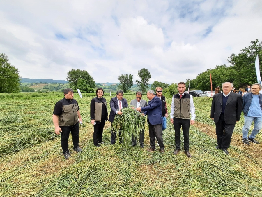 Çanakkale İl Tarım ve Orman Müdürlüğü tarafından Kaliteli Kaba Yem Üretiminin Arttırılması amacıyla hazırlanan, Tarım ve Orman Bakanlığı tarafından kabul edilerek finanse edilen “Baklagil-Buğdaygil Dörtlü Karışım Yem Bitkisi" projesinde verim yüzleri güldürdü. Kaliteli kaba yem üretiminin yaygınlaştırılması amacıyla Dörtlü Karışım Yem Bitkisi Projesinin hasadı, Çan ilçesine bağlı Helvacı Köyünde düzenlenen tarla gününde Mustafa Pınar'ın tarlasında gerçekleştirildi. Çanakkale İl Tarım Müdürü Erdem Karadağ, “Baklagil-Buğdaygil dörtlü karışım yem bitkisi projesi kapsamında Biga’da 7, Çan ilçemizde 4 olmak üzere 11 üreticimize %100 bakanlık katkılı 1375 kg tohum vererek 110 dekar alanda ekim yaptırdık. Çan İlçe Tarım ve Ormancılık Müdürlüğünce üreticilerimize 5 çuval içinde 125’er kg olmak üzere toplam 600 kg 4’lü karışım + 2 çuval üre gübresi verildi. Karışım içeriği %35 macar fiğ, %35 yem bezelyesi, %15 triticale ve %15 yulaf olmak üzere 13 Kasım 2022 tarihinde ekildi. Dekardan ortalama 6 ton verim beklenmektedir. Bu yem bitkisi ekilişinin yaygınlaştırılması için çalışmalara devam edilecektir. Protein oranı %22,5 olan 4’lü karışım yem bitkisi kuru şartlarda başarıyla yetişmekte ve kuru tarım arazilerinin değerlendirmesi, toprağın yapısını düzenlemesi ve veriminin yüksek olması gibi birçok sebepten dolayı önemli bir yem bitkisidir. Karlı bir hayvancılık yapabilmek için hayvanlarımızın tükettiği yemin büyük bir bölümünü kendimiz üretmemiz gerekir” dedi. Düzenlenen Tarla günü programına Çan Kaymakamı Mustafa Gürdal, İl Tarım ve Ormancılık Müdürü Erdem Karadağ, İlçe Tarım ve Ormancılık Müdürü Belma Türe, Çan İlçe Ziraat Odası Başkanı Hasan Şahin, Köy Muhtarları ve vatandaşlar katıldı.