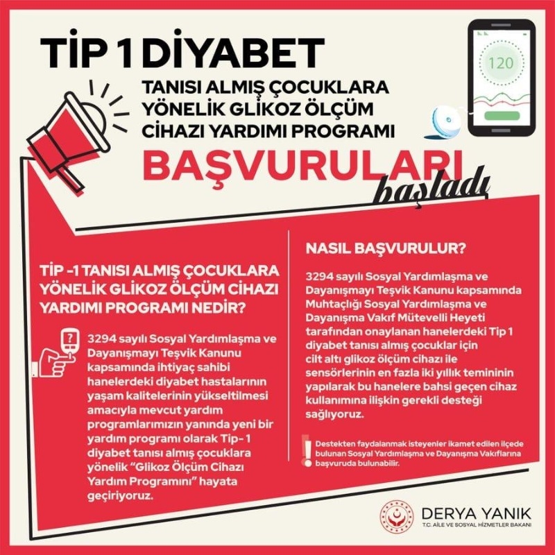 Çan Kaymakamlığı diyabet tanısı almış ve tedavi gören muhtaçlık kriterleri kapsamındaki hastalara 28.12.2022 tarihinden itibaren “Glikoz Ölçüm Cihazı Yardımı Programı” başlatıldığını duyurdu. Cumhurbaşkanlığı Makam Onayına istinaden Aile ve Sosyal Hizmetler Bakanlığınca 0-22 yaş arası Tip-1 Diyabet Tanısı almış ve tedavi gören muhtaçlık kriterleri kapsamındaki hastalara 28.12.2022 tarihinden itibaren “Glikoz Ölçüm Cihazı Yardımı Programı” başlatıldı. Çan Kaymakamlığı sosyal medya hesabından yapılan paylaşımda, “Sosyal Yardım Faydalanıcısı ve muhtaçlık kriterleri kapsamında bulunan Tip-1 Diyabet Tanısı Almış Kişilere Yönelik Glikoz Ölçüm Cihazı Yardımı İl/İlçe Sosyal Yardımlaşma ve Dayanışma Vakıflarımıza müracaat etmeleri durumunda talepleri 10.03.2025 tarihine kadar değerlendirilmeye devam edilecektir” ifadelerine yer verildi.