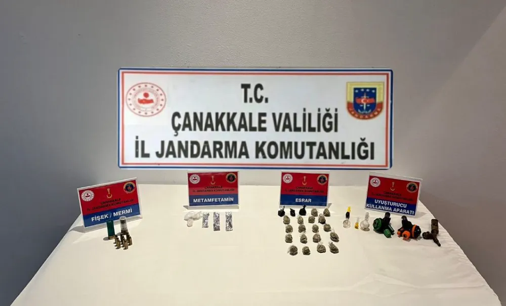 Çanakkale İl Jandarma Komutanlığı ekiplerince merkez ve 2 ilçede uyuşturucu madde imal ve ticareti yapanlara yönelik düzenlenen operasyonda 8 şüpheli gözaltına alındı. Çanakkale İl Jandarma Komutanlığı ekipleri, uyuşturucu madde imal ve ticareti yapanlara geçit vermiyor. Ekipler, il dışından kente getirilen uyuşturucu maddelerin satılmasını engellemek ve zehir tacirlerinin yakalanması için çalışma başlattı. Çanakkale, Lapseki ve Ayvacık ilçelerinde eş zamanlı düzenlenen operasyonda 17 GK 743 ve 35 EF 265 plakalı araçlar ile şüphelilerin ikametlerinde narkotik köpeği ile yapılan aramalarda 11 gram metamfetamin, bin 565 gram esrar maddesi, 3 uyuşturucu madde kullanma aparatı, öğütücü, 12 sentetik hap, hassas terazi, tabanca, 48 tabanca fişeği, 2 av tüfeği kartuşu ele geçirildi. Jandarma tarafından şüpheliler S.F., H.A.P., H.A., E.Ö., E.G., S.K., Ö.Ö. ve yabancı uyruklu S.E. gözaltına alındı. Şüpheliler jandarmadaki işlemlerinin ardından adliyeye sevk edilecek.