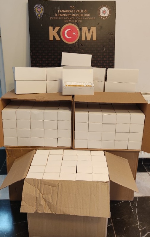 Çanakkale ve Çan ilçesinde kaçak sigara operasyonunda polis 2 şüpheliyi gözaltına aldı. Bir şüpheliyi yakalama çalışmaları devam ederken, operasyonda çok sayıda kaçak sigara ele geçirildi. Çanakkale İl Emniyet Müdürlüğü Kaçakçılık ve Organize Suçlarla Mücadele (KOM) Şube Müdürlüğü ekiplerince, kaçakçılıkla mücadele çerçevesinde il merkezi ve Çan ilçesinde kaçak sigara operasyonu düzenlendi. Operasyonda şüpheliler, İ.T, E.Ö ve M.Ş'nin adreslerinde arama yapıldı. Operasyonda, TAPDK Bandrolü bulunmayan 50 bin dal boş makaron, 8 bin dal doldurulmuş sigara, 46 bin dal bandrolsüz boş makaron, 43 bin 800 dal bandrollü boş makaron, 82 kilogram bandrollü tütün, 2 elektrikli sigara doldurma makinesi, 2 kompresör makinası ve 30 kilogram açık kıyılmış tütün ele geçirildi. Gözaltına alınan şüpheliler E.Ö. ve M.Ş. hakkında adli işlem başlatıldı. Şüpheliler, E.Ö. ve M.Ş. emniyetteki işlemlerinin ardından savcılık talimatıyla serbest bırakıldı. Şüpheli İ.T'yi ise yakalama çalışmalarının devam ettiği bildirildi.