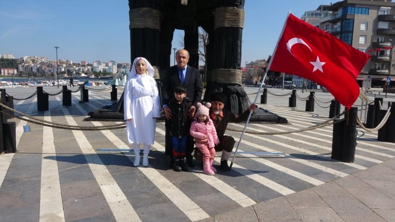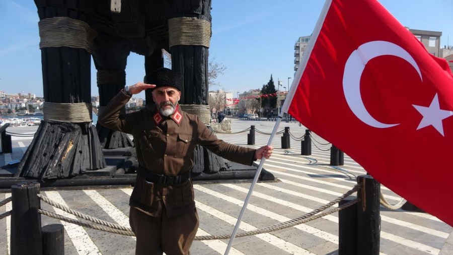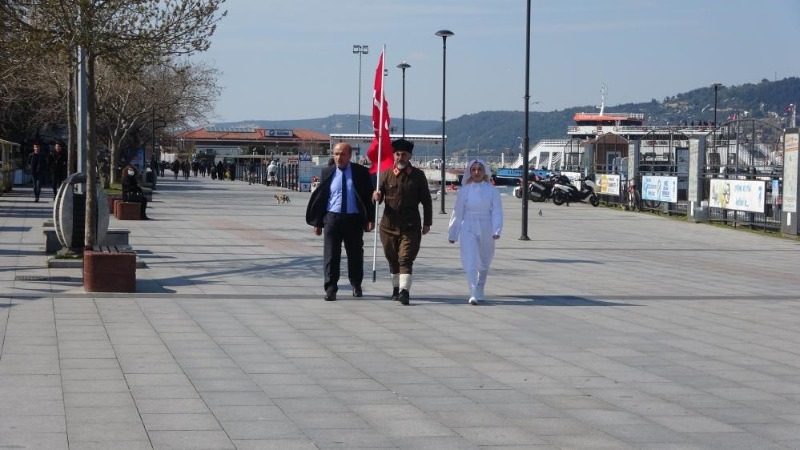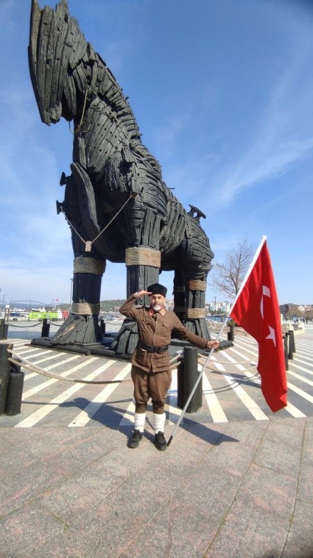 Çanakkale Deniz Zaferi’nin 107. yıl dönümü dolayısıyla İstanbul’dan yola çıkan Çanakkale gazisi torunu ve Tokat Onbeşli Torunları Derneği Başkanı Saffet Gümüş, 375 kilometrede 508 bin adım atarak Çanakkale’ye ulaştı. Çanakkale Deniz Zaferi'nin 107'nci yıl dönümünde şehitler için İstanbul'un Bağcılar ilçesinden elinde Türk bayrağı ile yola çıkan Tokat Onbeşli Torunları Derneği Başkanı Saffet Gümüş ve beraberindeki iki kişi Çanakkale’ye ulaştı. Saffet Gümüş, kordon boyunda bulunan Truva Atı önünde vatandaşlarla hatıra fotoğrafı çektirdi. İstanbul’dan Çanakkale’ye 508 bin adımla geldiğini belirten Tokat Onbeşli Torunları Derneği Başkanı Saffet Gümüş, “Bundan tam 10 gün önce İstanbul’un Esenler ilçesinden almış olduğum bayrağı, Çanakkale şehitler diyarına ulaştırdık. Torundan dedeye veda yürüyüşünde 375 kilometrede 508 bin adım atmışız. Bizim dedelerimize vefamız, bu yolları yürümekle de bitmez. Çünkü onlar bizim için bundan 107 yıl önce Gazi Mustafa Kemal Atatürk ve silah arkadaşlarıyla beraber bayrağımıza ve devletimize sahip çıktılar. Bizler de onlara vefamızı gösterebilmek için yol yürüdük, yağmur yedik, dolu yedik. Tüm şehitlerimizin mekanı cennet olsun” diye konuştu. Gümüş yaptığı açıklamanın ardından, vatandaşlarla hatıra fotoğrafı çektirdi.